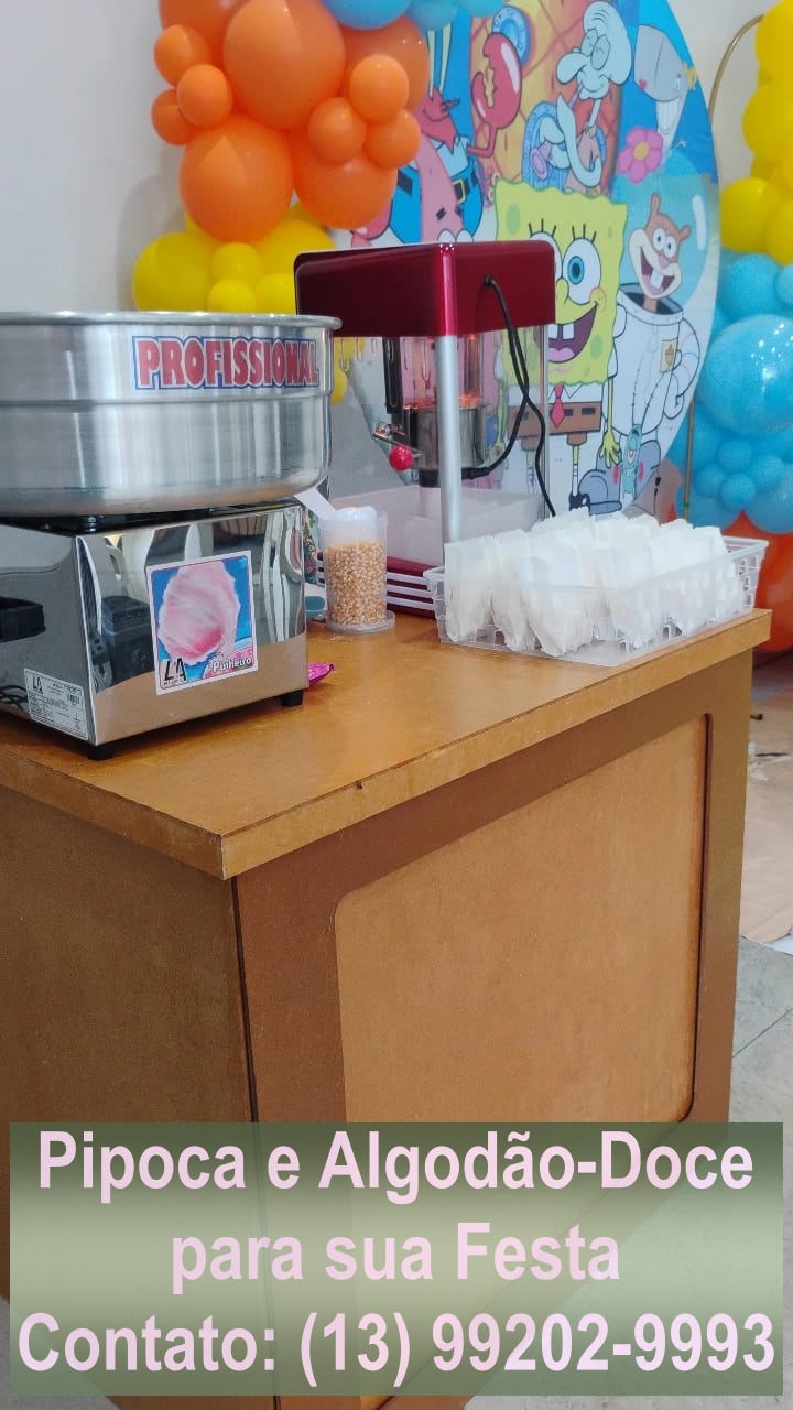 Levo até você pipoca de cinema fresquinha e algodão doce super colorido, feitos na hora para encantar crianças e adultos!